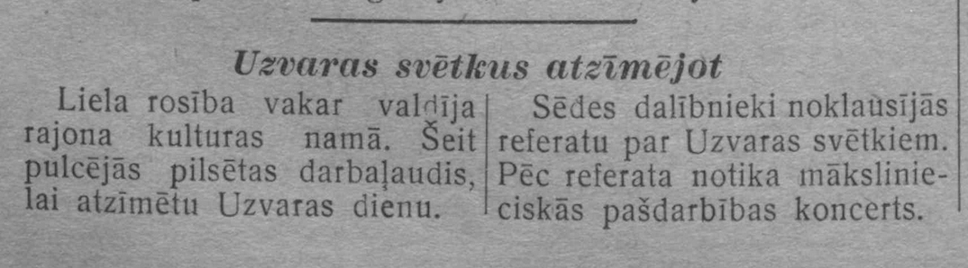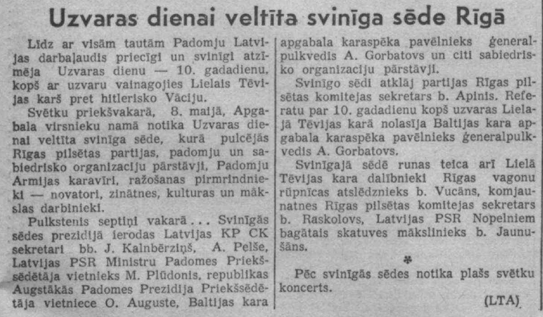 С того победного года дата 9 мая стала для жителей Латвийской ССР днем единства, наполненным, с одной стороны, счастьем, с другой стороны, безграничной благодарностью всем тем, кто сплотился в борьбе против гитлеровских захватчиков и их союзников.