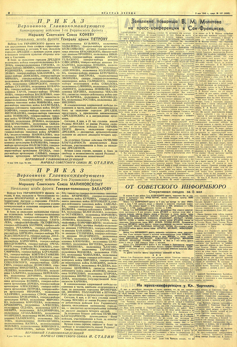 "Около четырех лет мы ждали этого дня, дня, когда мы услышим это прекрасное слово – победа! И вот, час тому назад радио принесло нам эту радостную весть в город Тукумс, за день до этого освобожденный нашими войсками. Трудно описать, с какой радостью мы встретили это известие. Еще до сих пор раздаются крики "Ура!". У всех на лицах улыбки, и мне кажется, что за эти четыре года люди впервые такие веселые", – писал старший сержант Борис Цозик из латвийского города Тукумс своим родителям.