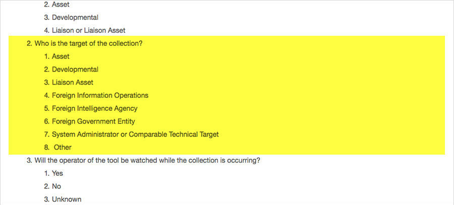 "Case Officers are allowed to configure a subset of the full capabilities of the provided tools. To configure a tool for an operation the case officer must answer a set of questions about the operation. The provided tool will then be configured based upon the answers to the questions," the document read.