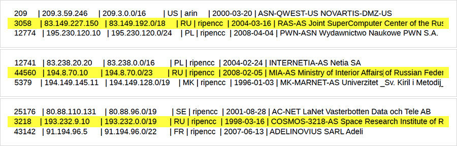 The list also contains several IPs located in Russia. They are assigned to different institutions of the Russian Academy of Sciences, including the Interdepartmental Supercomputer Center and Institute for Space Studies, as well as companies MTS, Sibirtelecom and Sinterra, and even the Russian Interior Ministry.